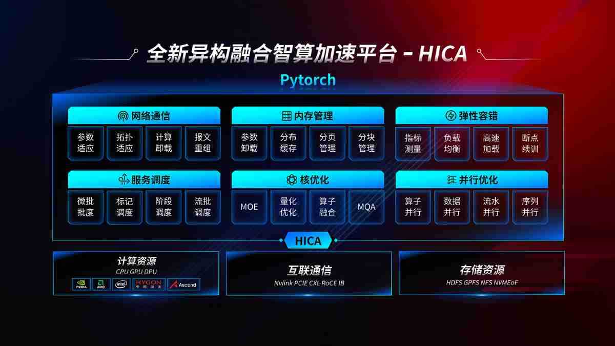 通过自研的服务层、、中间适配层、、、以及调度编排算法,,,,采用数据并行、、、模型并行等多种并行方式,,,,把并行计算任务进行有效的分解,,,,使其分别由相应的软件栈和算力资源来承接。。当GPU资源变化,,HICA可以实时动态调度计算子任务并调整模型拓扑和架构,,以充分聚合各种算力资源。。