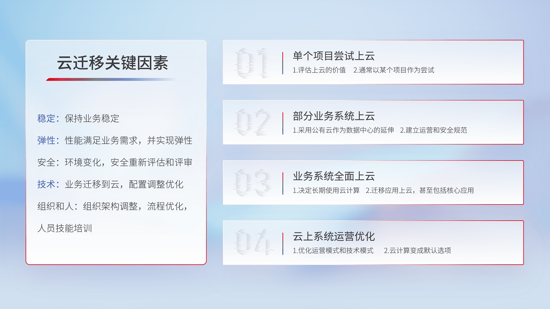 结合实际业务,,,从规划设计、、、云平台选型、、、云原生改造、、数据迁移、、集成交付,,,迁移全过程为客户识别最佳上云路径,,,做好风险识别管理,,设计网络架构、、、身份权限、、、安全审计合规、、、操作审计、、日志审计、、监控告警策略、、多站点容灾设计等,,,对云上基础设施进行整体规划,,,提升IT治理水平,,,,以满足弹性、、、、高可用、、高性能的需求。。。
