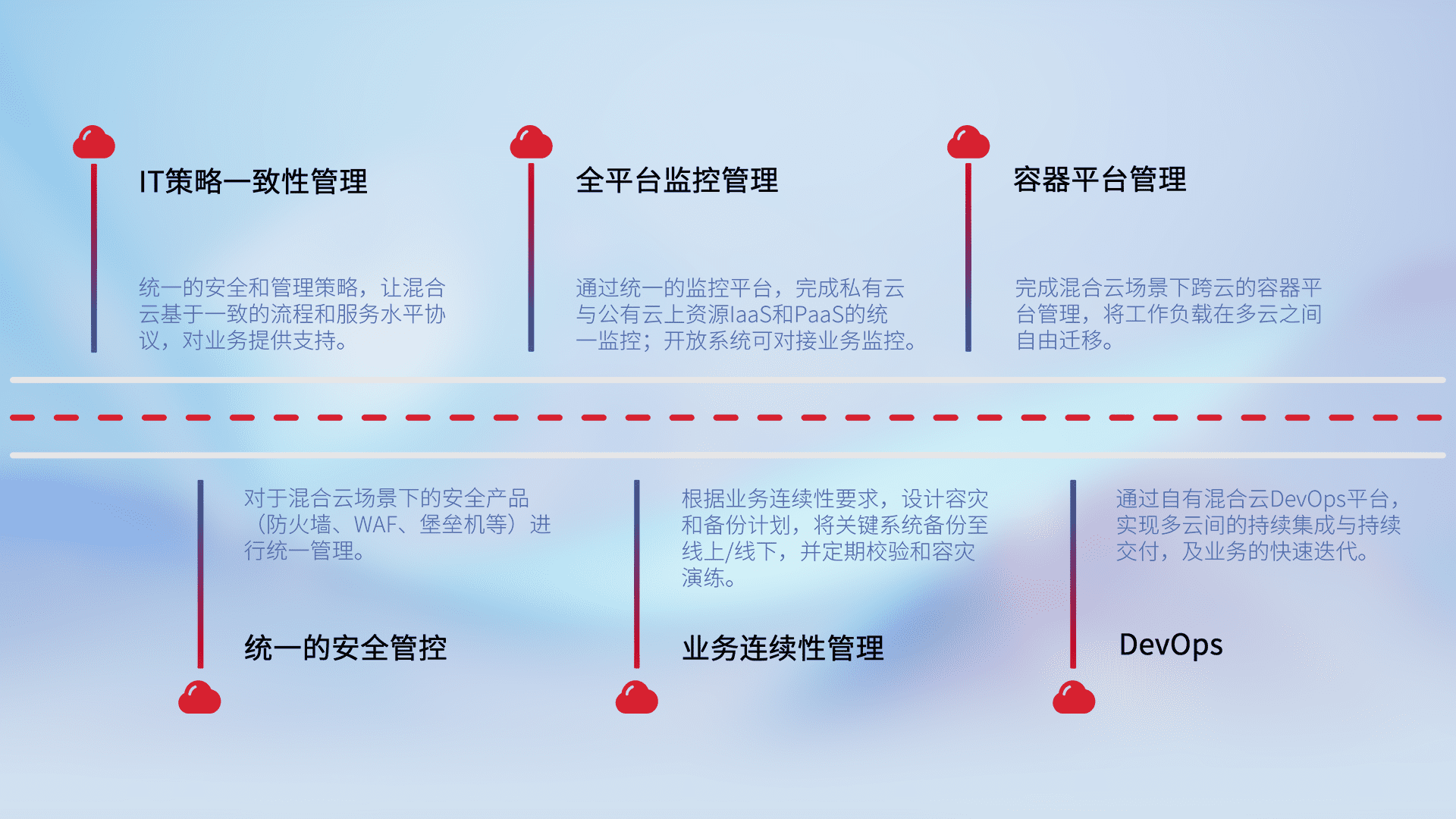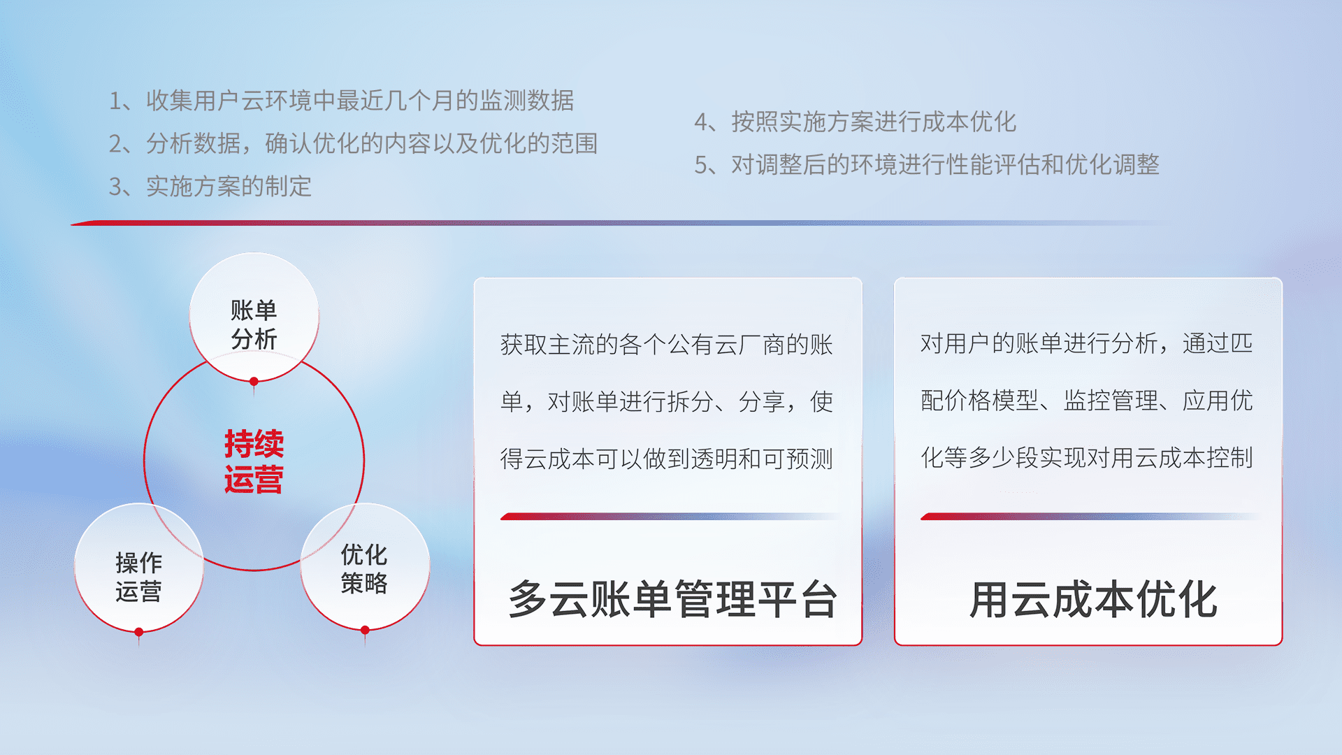 通过多云纳管,,,以统一的资源数据模型把客户的云资源进行抽象和封装,,进而实现对多云资源的统一操作,,,,保障云资源管理的可靠性、、、稳定性与可用性。。量身定制化运维内容,,,,配置、、、、开发运维、、、、补丁管理、、备份、、、、监控、、、、认证和访问管理、、审计和日常巡检等,,,,保障在用云过程中的可靠度,,,稳定度以及高可用率。。